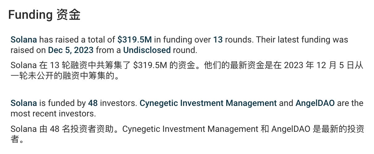 根据Crunchbase统计数据显示,Solana截止目前已进行了13轮融资,共筹得约3.2亿美元。最大单笔融资是由Andreessen Horowitz (a16z) 领投,于2021 年 6 月融资了 3.14 亿美元。