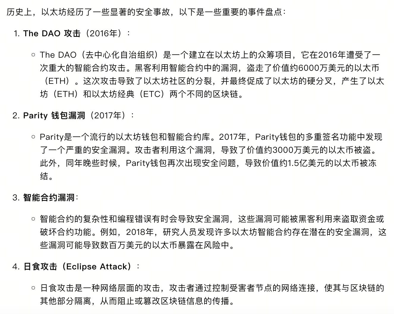如2016的The DAO众筹项目,攻击者利用了智能合约中的一个递归调用漏洞,从资金池中盗取了约350万个ETH(当时价值约为6000万美元)。这次攻击直接导致了以太坊社区的分裂,并最终促成了以太坊的硬分叉(分为ETH和ETC两条不同的链)。这暴露了智能合约和整个网络的潜在安全风险,隐藏未知的安全漏洞。