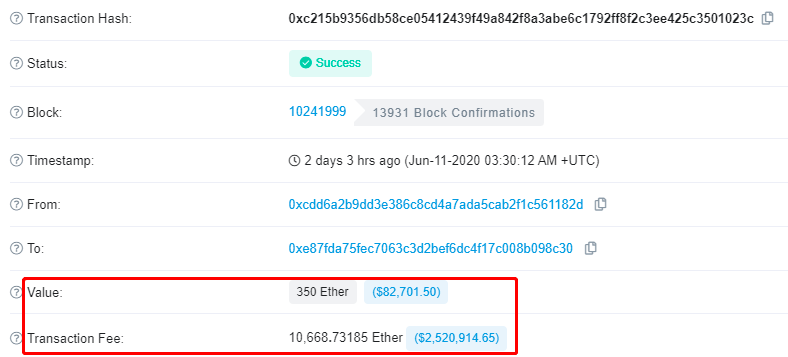 (2019年一笔天价矿工费:手续费高达 10,668.73185 个 ETH ,而转账金额只为 350个 ETH,是手续费的3%。)
