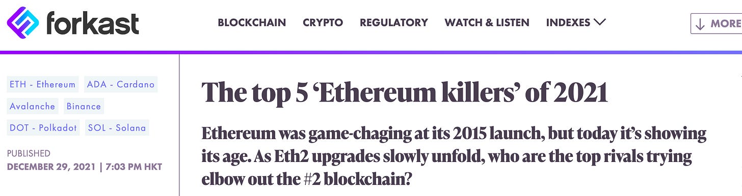 我在这里翻到「forkast」上2021年末的一篇文章,名为「The top 5 ‘Ethereum killers’ of 2021」,里面列出了以下5个「以太坊杀手」: