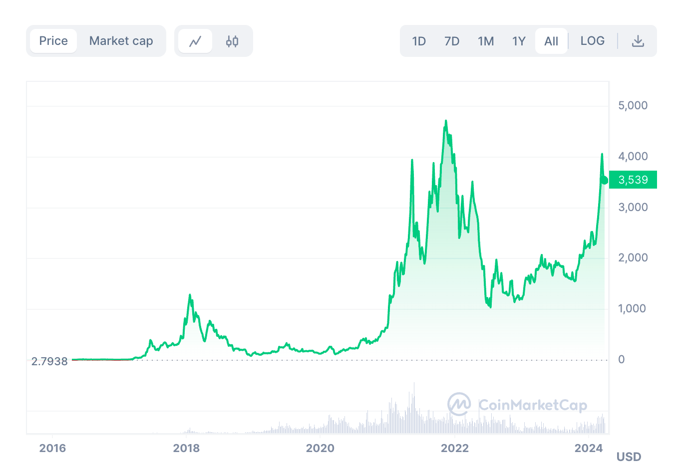 综上,在以太坊平台上进行ICO的狂潮,也带来了一众项目方和投资者对ETH货币本身的大量购入需求,ETH币价随之水涨船高,2017年底已来到1400美元高位。