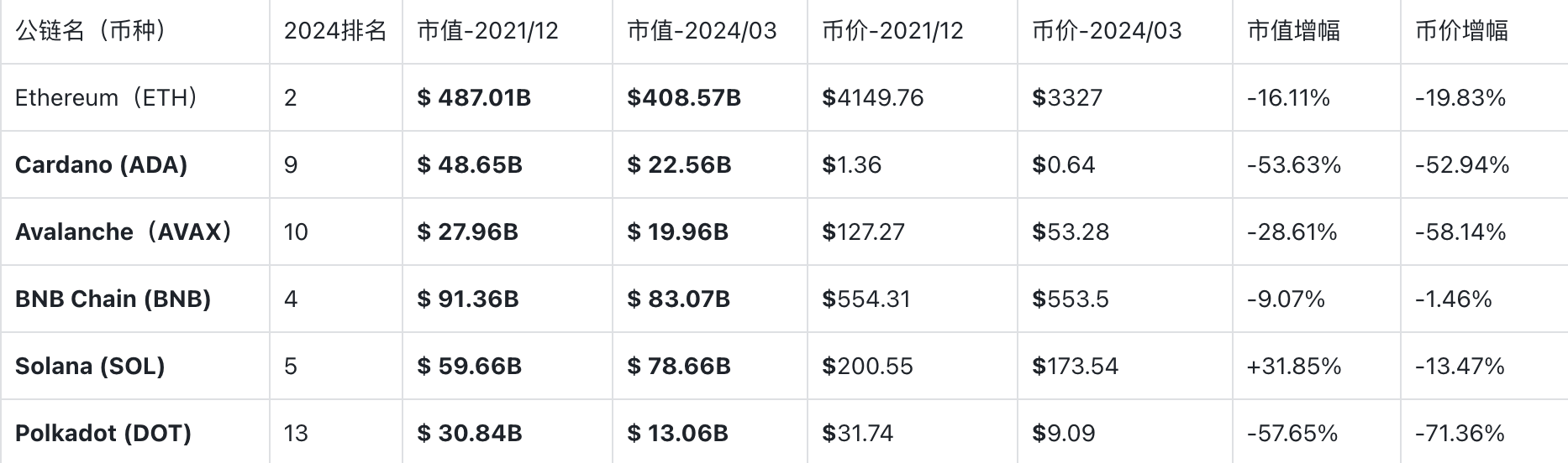 从表格中可以看出,经过了一轮熊市之后,各币种价格都有所下跌。