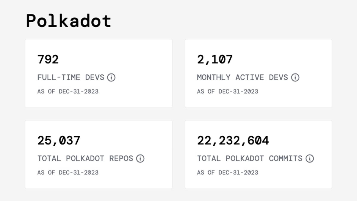 开发者生态活跃。据 Electric Capital 发布的 2023 年开发者报告显示,波卡网络开发人员于 2023 年全年共计提交 22,232,604 条原始代码,开发者贡献占 Web3 领域所有提交代码的 10.5%,拥有第二多的全职开发者数量,仅次于以太坊,达到 792 名。