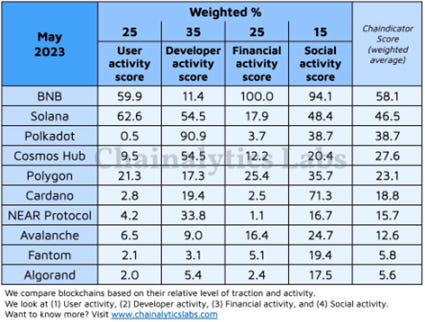 根据 Chainalytics Labs 2023年 5 月的主流公链活跃程度统计,从「用户活跃度」、「开发者活跃情况」、「财政状况」、以及「社交活跃度」四个方面来看,波卡除了开发者参与度排名较为领先,其他得分与 BNB 与 Solana 相差非常大,用户活跃度指标排名甚至最低,综合排名位居第三。